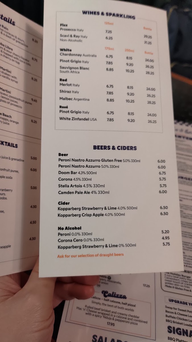 Beverages include a range of cocktails—examples being the Espresso Martini, Tia Maria and Coke, and Pink Gin Cocktail—as well as wine and coffee options. The menu supports both casual dining and quicker orders, making it suitable for different meal times from breakfast through to dinner.